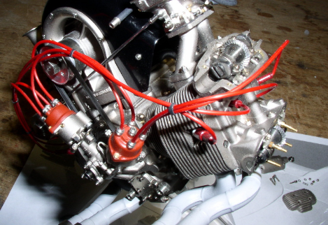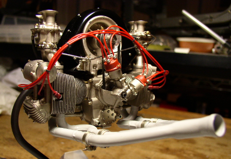 A jewel-like 1:8 scale model, individually hand-built by a European craftsman (Nolte) who made all parts himself from the appropriate metals, rubber, bolts and screws. Bolted assembly like the real engine, no glue. Fully movable internals: functional flywheel, fan, crankshaft, pistons, cams, and valvetrain. Other perfect details include accurate ignition wires, oil and fuel lines, Weber carburetors with working linkages, and a full exhaust system. Can be displayed with cam cover (or any other pieces) removed to show internal details.