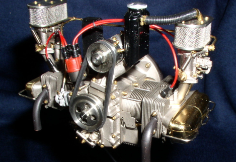 A jewel-like 1:8 scale model, individually hand-built by a European craftsman (Nolte) who made all parts himself from the appropriate metals, rubber, bolts and screws. Bolted assembly like the real engine, no glue. Fully movable internals: functional flywheel, fan, crankshaft, pistons, cams, and valvetrain. Other perfect details include accurate ignition wires, oil and fuel lines, Weber carburetors with working linkages, and a full exhaust system. Can be displayed with cam cover (or any other pieces) removed to show internal details.